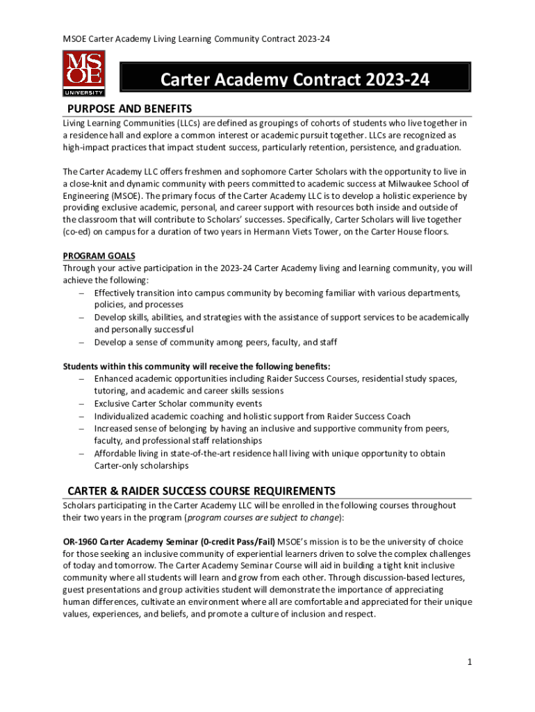 SOE Carter Academy Living Learning Community Contract 202324Carter Academy Contract 202324 PURPOSE AND BENEFITSLiving Learning Communities (LCS) are defined as groupings of cohorts of students who