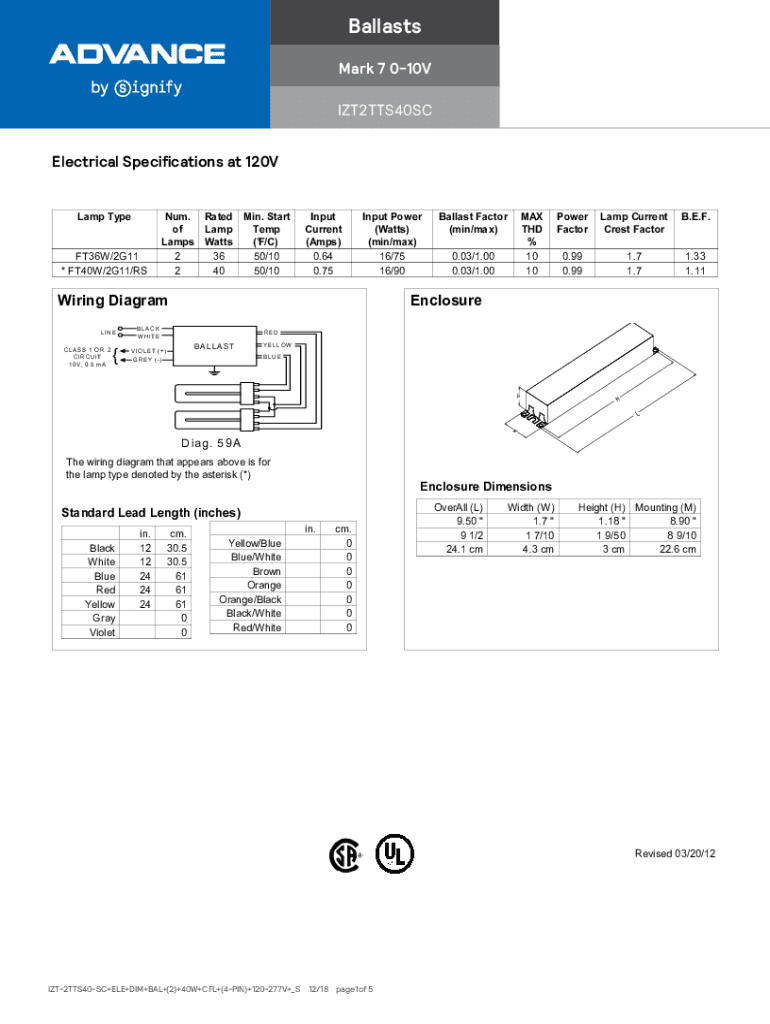 Ballasts Mark 7 010V IZT2TTS40SC Electrical Specifications at 120V Lamp Type FT36W/2G11 * FT40W/2G11/Sum. Rated Min. Start of Lamp Temp Lamps Watts (F/C) 2 36 50/10 2 40 50/10Input Current (Amps)