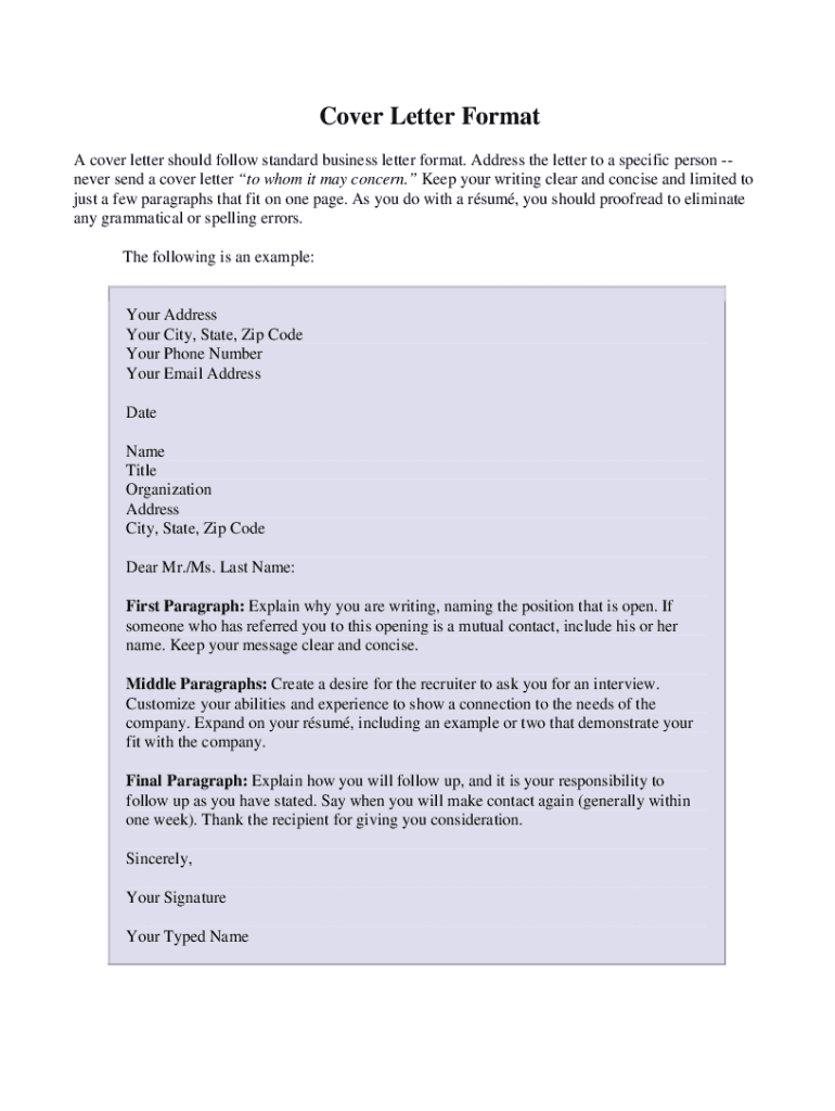 Cover Letter Format A cover letter should follow standard business letter format. Address the letter to a specific person never send a cover letter to whom it may concern. Keep your writing clear
