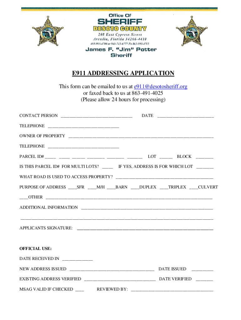 E911 ADDRESSING APPLICATION This form can be emailed to us at e911@desotosheriff.org or faxed back to us at 8634914025 (Please allow 24 hours for processing) CONTACT PERSON ___DATE ___TELEPHONE ___