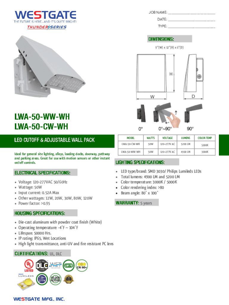 JOB NAME: ___ DATE: ___ TYPE: ___9(W) x 12(H) x 6(D)Ideal for general site lighting, alleys, loading docks, doorway, pathway and parking areas. Great for use with motion sensors or other instant on/off