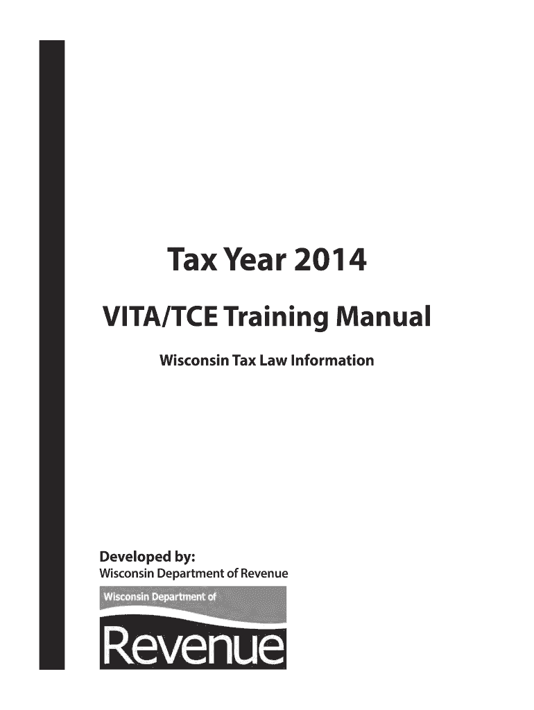 Tax Year 2014 VITA/THE Training Manual Wisconsin Tax Law Information Developed by: Wisconsin Department of Revenue Table of Contents Sections Pages General information/Form 1 Message from Secretary