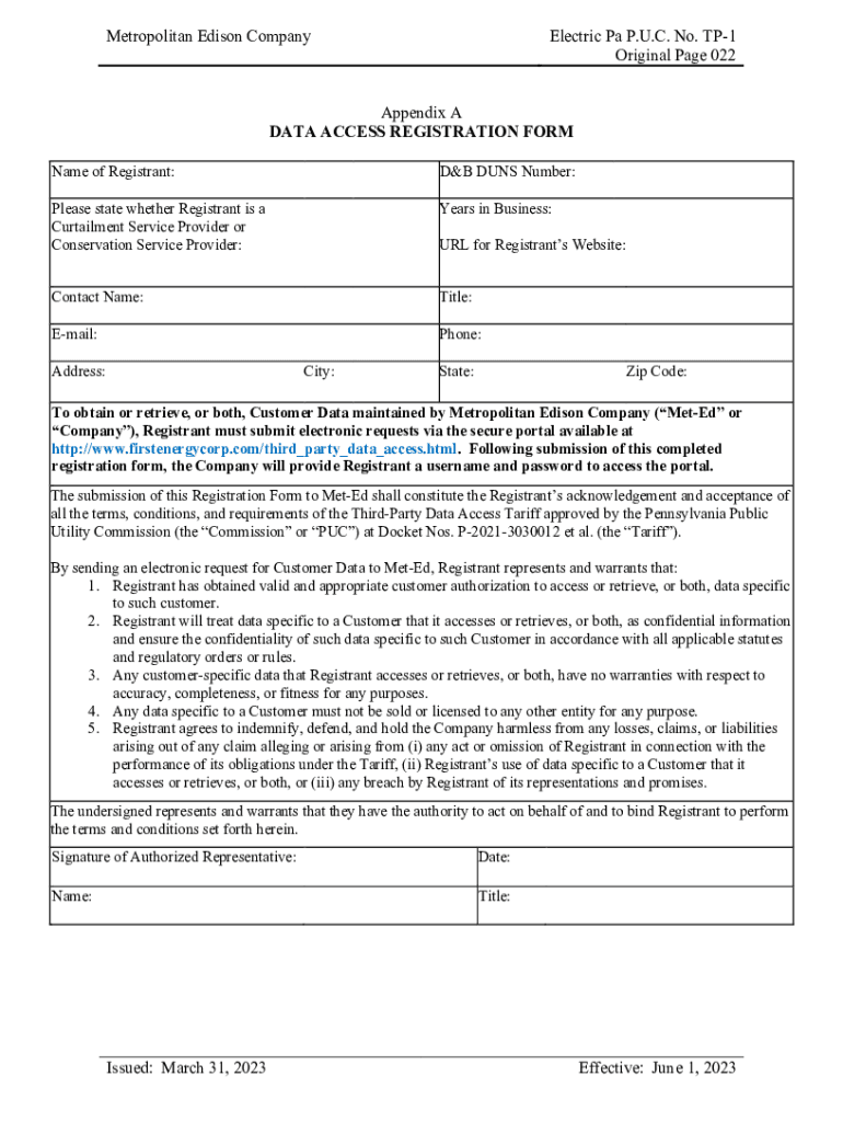 Metropolitan Edison CompanyElectric Pa P.U.C. No. TP1 Original Page 022Appendix A DATA ACCESS REGISTRATION FORM Name of Registrant:D&B DUNS Number:Please state whether Registrant is a Curtailment