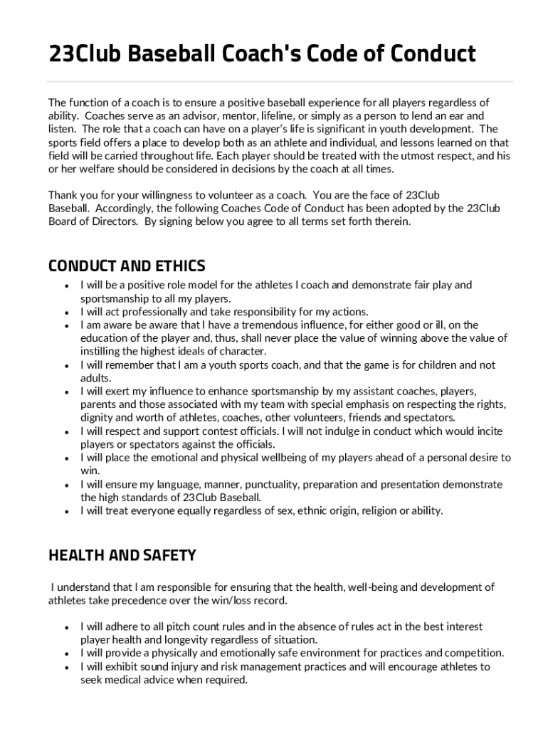 23Club Baseball Coach\'s Code of Conduct The function of a coach is to ensure a positive baseball experience for all players regardless of ability. Coaches serve as an advisor, mentor, lifeline, or