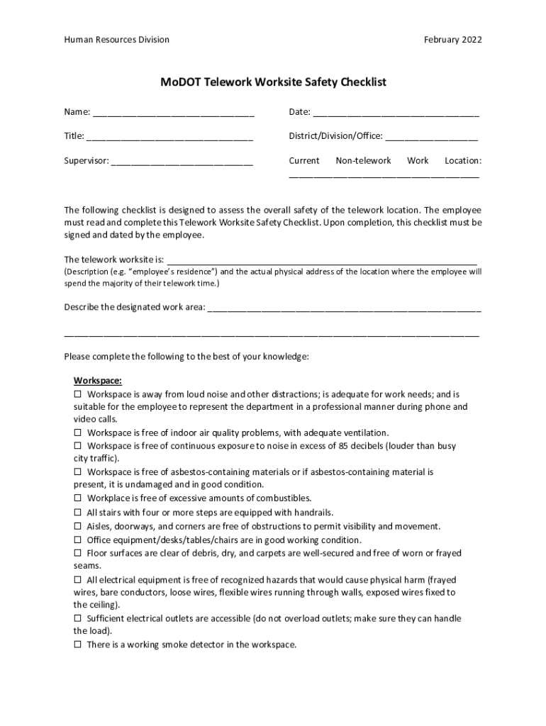 Human Resources Division February 2022MoDOT Telework Worksite Safety Checklist Name: ___Date: ___Title: ___District/Division/Office: ___Supervisor: ___Telework Work Location: Current ___The following