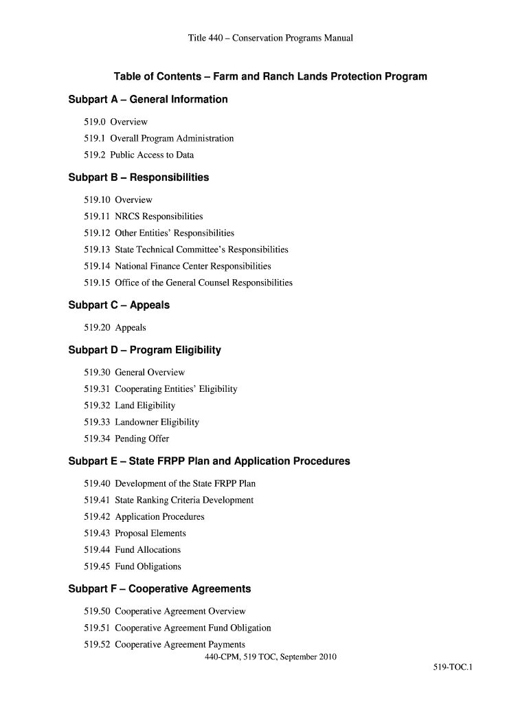 Title 440 Conservation Programs Manual Table of Contents Farm and Ranch Lands Protection Program Subpart A General Information 519.0 Overview 519.1 Overall Program Administration 519.2 Public Access