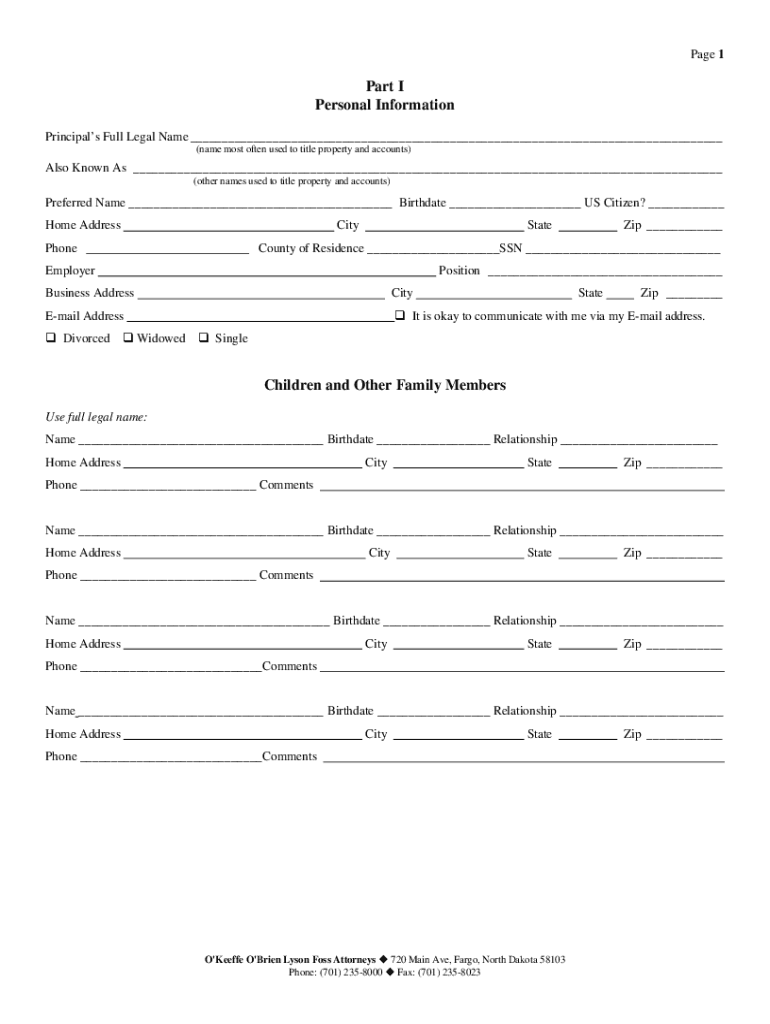 Individual Estate Plan Intake Worksheet Keeffe O'Brien Lyon FOSS Attorneys Estate and Trust PlanningUSING THIS ORGANIZER WILL ASSIST US IN DESIGNING AN ESTATE PLAN THAT MEETS YOUR GOALS. ALL INFORMATION