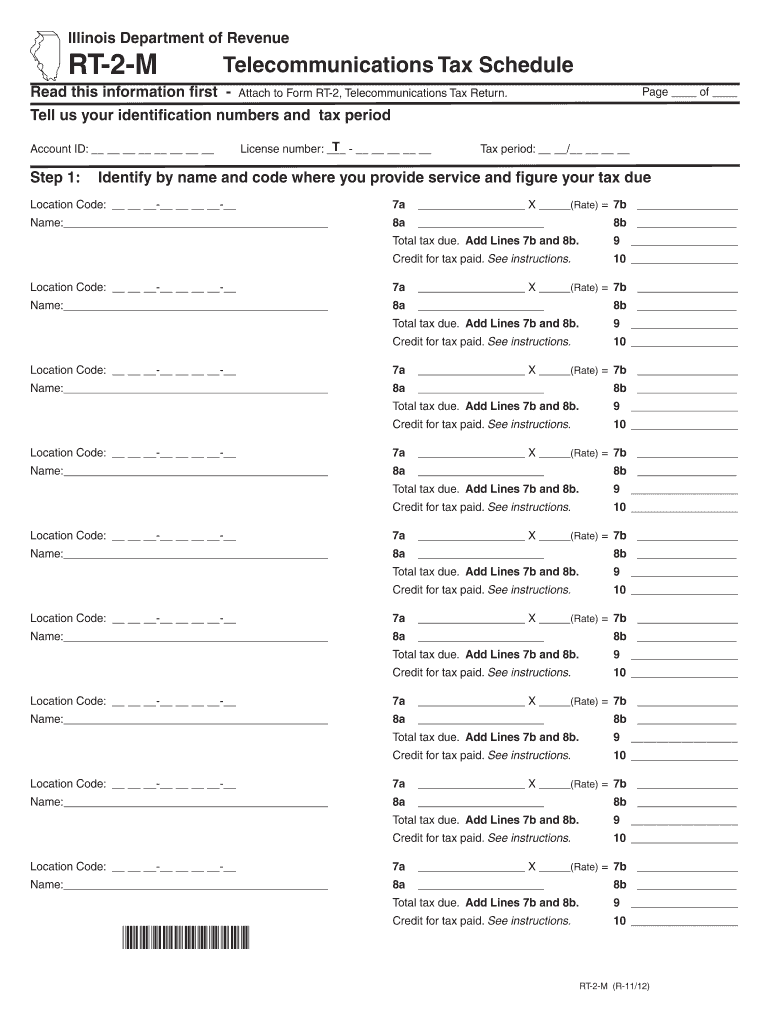 Use your mouse or Tab key to move through the fields. Use your mouse or space bar to enable check boxes. Illinois Department of Revenue RT-2-M Telecommunications Tax Schedule Read this information