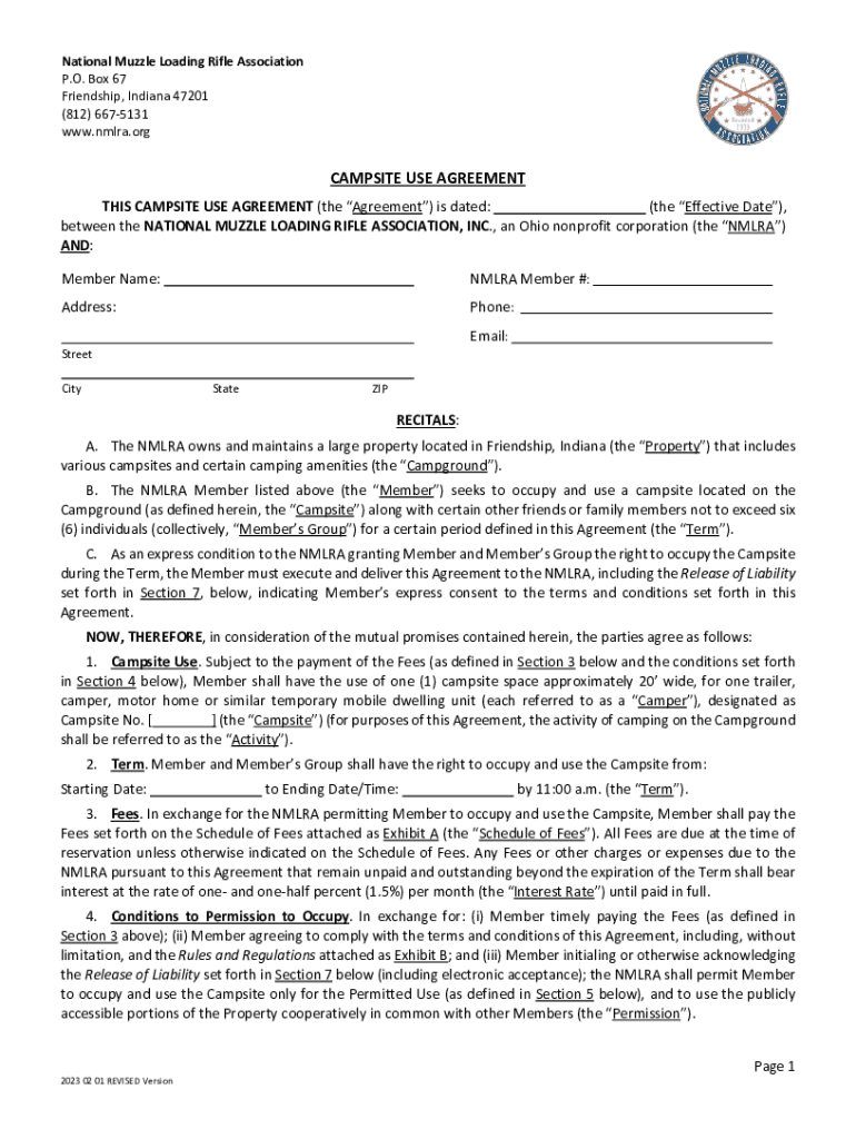 National Muzzle Loading Rifle Association P.O. Box 67 Friendship, Indiana 47201 (812) 6675131 www.nmlra.orgCAMPSITE USE AGREEMENT THIS CAMPSITE USE AGREEMENT (the Agreement) is dated: (the Effective