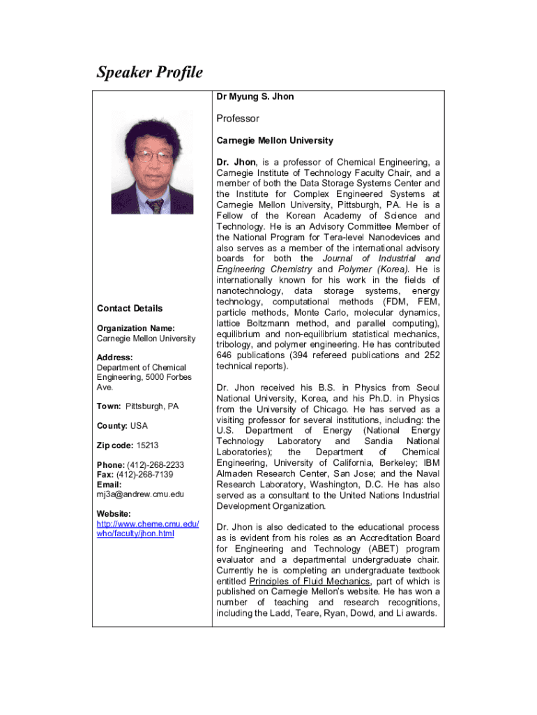 Speaker Profile Dr Mung S. JhonProfessor Carnegie Mellon UniversityContact Details Organization Name: Carnegie Mellon University Address: Department of Chemical Engineering, 5000 Forbes Ave. Town: