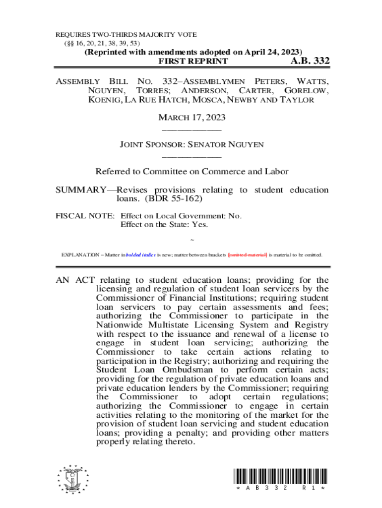 REQUIRES THIRDS MAJORITY VOTE (16, 20, 21, 38, 39, 53)(Reprinted with amendments adopted on April 24, 2023) FIRST REPRINT A.B.332ASSEMBLY BILL NO. 332ASSEMBLYMEN PETERS, WATTS, NGUYEN, TORRES; ANDERSON,