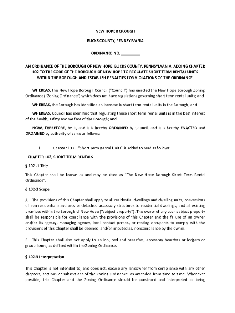 NEW HOPE BOROUGH BUCKS COUNTY, PENNSYLVANIA ORDINANCE NO. AN ORDINANCE OF THE BOROUGH OF NEW HOPE, BUCKS COUNTY, PENNSYLVANIA, ADDING CHAPTER 102 TO THE CODE OF THE BOROUGH OF NEW HOPE TO REGULATE