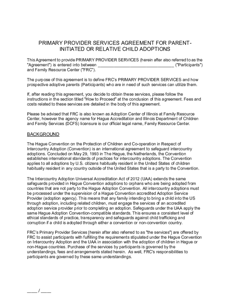 PRIMARY PROVIDER SERVICES AGREEMENT FOR PARENTINITIATED OR RELATIVE CHILD ADOPTIONS This Agreement to provide PRIMARY PROVIDER SERVICES (herein after also referred to as the \” Agreement\”) is