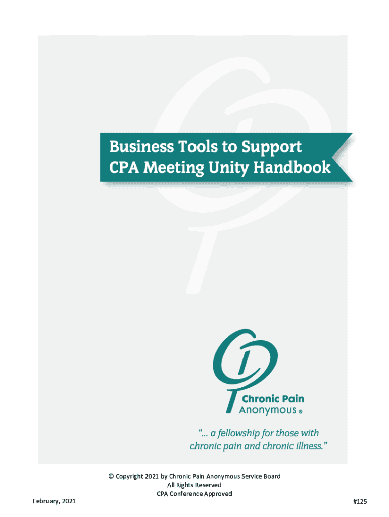 Business Tools to Support CPA Meeting Unity Handbook February 2021 Copyright 2021 by Chronic Pain Anonymous Service Boardwalk Rights Reserved CPA Conference Approved#112January 1,#125Business Tools