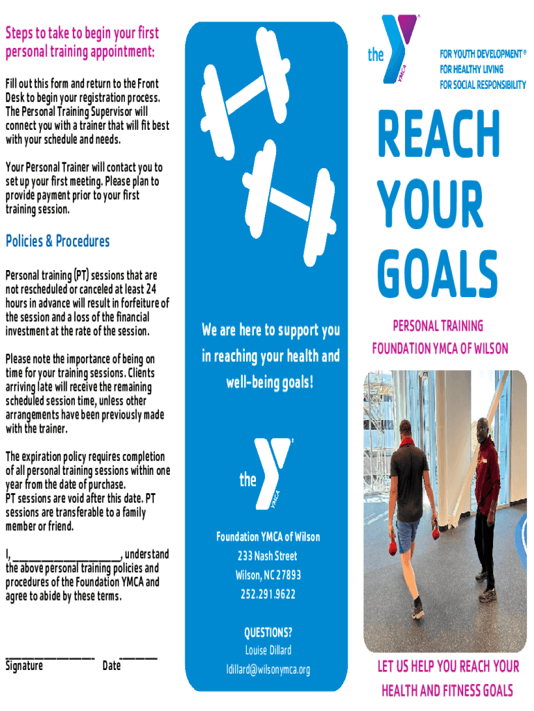 Steps to take to begin your first personal training appointment: Fill out this form and return to the Front Desk to begin your registration process. The Personal Training Supervisor will connect you