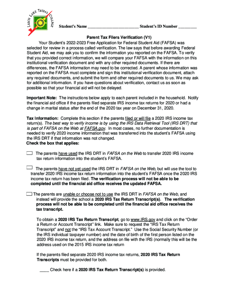 Students Name ___ Students ID Number ___ Parent Tax Filers Verification (V1) Your Students 20222023 Free Application for Federal Student Aid (FAFSA) was selected for review in a process called verification.