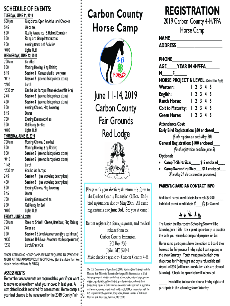 SCHEDULE OF EVENTS:June 1114, 2019 Carbon County Fair Grounds Red Lodge2019 Carbon County 4H/FFA Horse Camp NAME___ ADDRESS ___ ___ PHONE___ AGE___YEAR IN 4H/FFA___ M___F___ HORSE PROJECT & LEVEL
