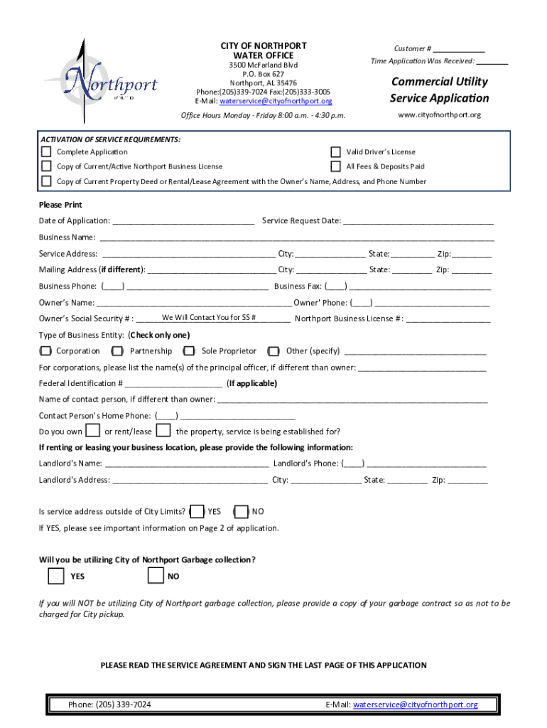 CITY OF NORTHPORT WATER OFFICE 3500 McFarland Blvd P.O. Box 627 Northport, AL 35476 Phone:(205)3397024 Fax:(205)3333005 Email: waterservice@cityofnorthport.org Office Hours Monday Friday 8:00 a.m.