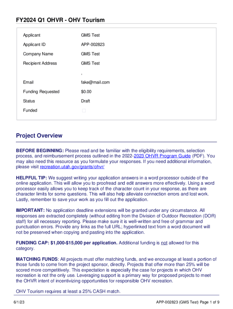 FY2024 Q1 OR OH Tourism Applicant GMS TestApplicant IDAPP002823Company Name GMS TestRecipient Address GMS Test, Emailfake@mail.comFunding Requested$0.00StatusDraftFundedProject Overview BEFORE BEGINNING: