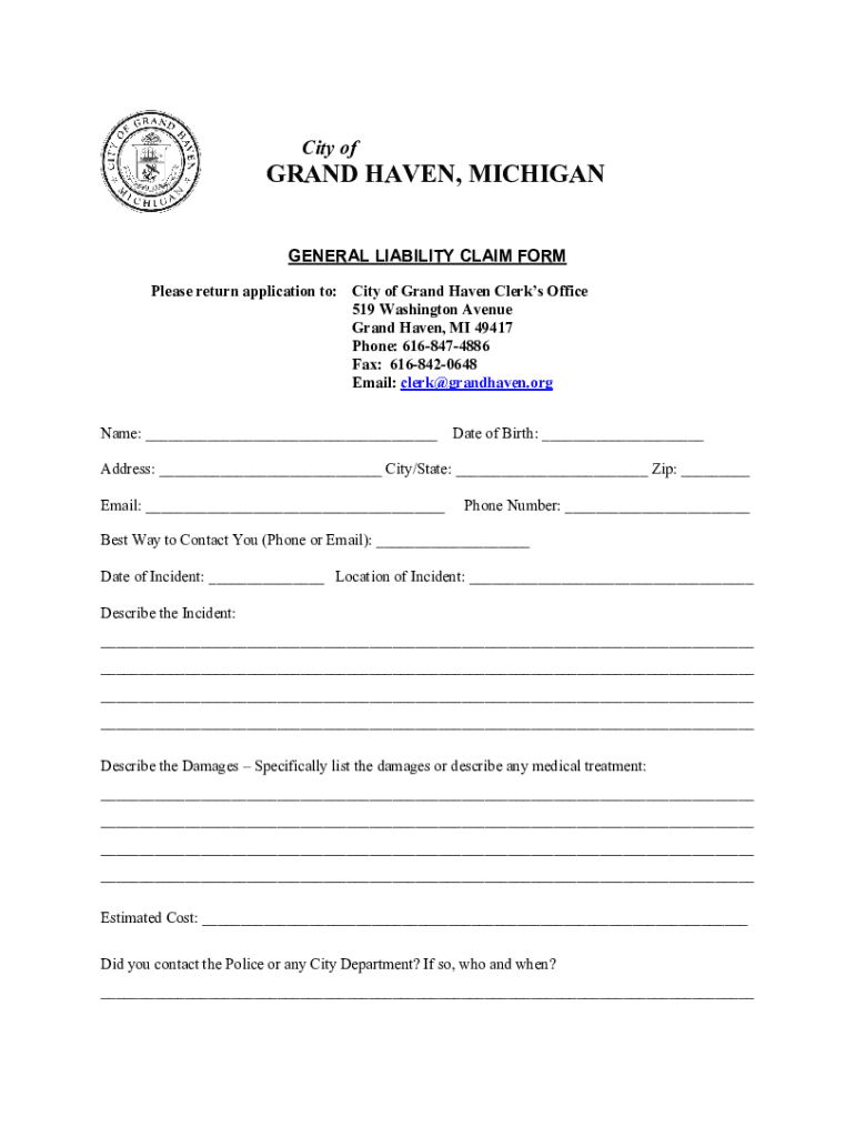 City grand HAVEN, MICHIGAN GENERAL LIABILITY CLAIM FORM Please return application to: City of Grand Haven Clerks Office 519 Washington Avenue Grand Haven, MI 49417 Phone: 6168474886 Fax: 6168420648