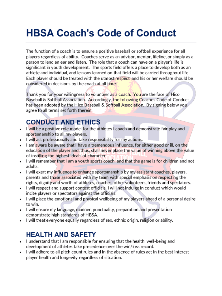 BSA Coach\'s Code of Conduct The function of a coach is to ensure a positive baseball or softball experience for all players regardless of ability. Coaches serve as an advisor, mentor, lifeline, or
