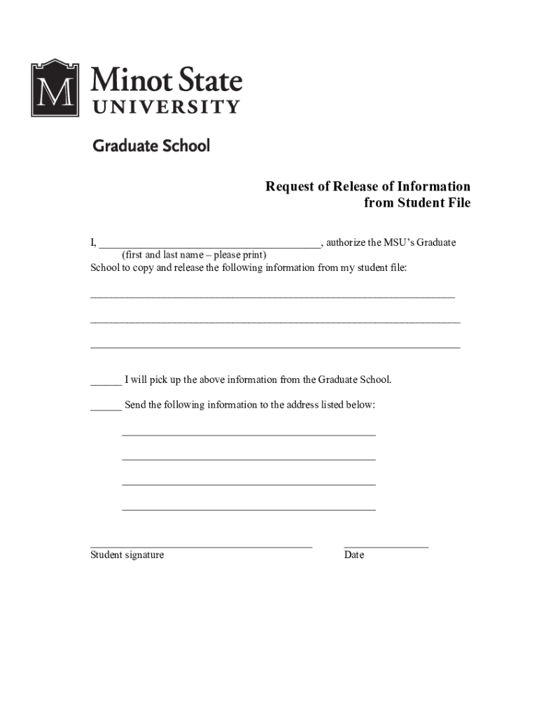 Request of Release of Information from Student File I, ___, authorize the MSFS Graduate (first and last name please print) School to copy and release the following information from my student file: