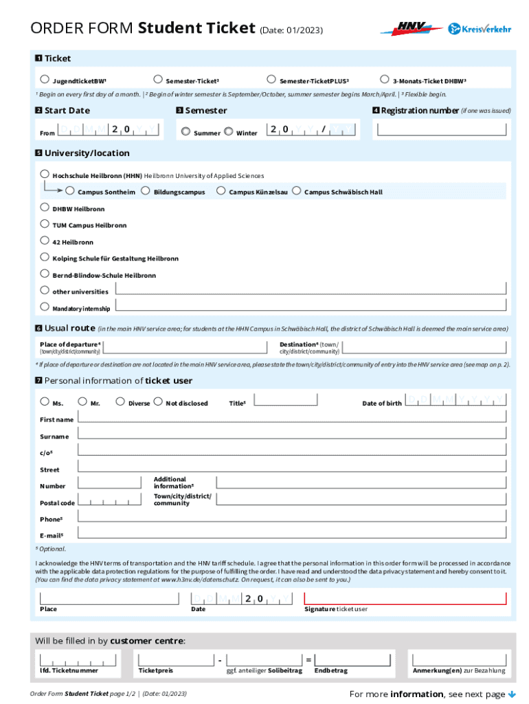 ORDER FORM Student Ticket (Date: 01/2023) 1Ticket JugendticketBW1SemesterTicket2SemesterTicketPLUS23MonatsTicket DHBW31 Begin on every first day of a month. | 2 Begin of winter semester is September/October,
