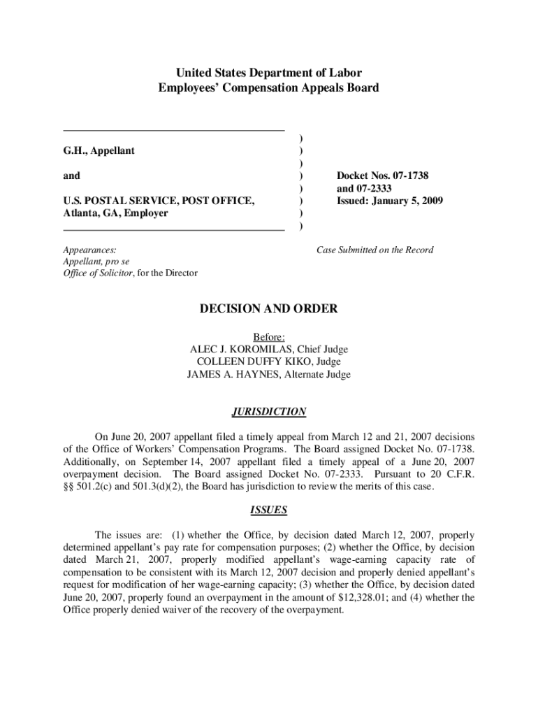 United States Department of Labor Employees Compensation Appeals Board ___ G.H., Appellant and U.S. POSTAL SERVICE, POST OFFICE, Atlanta, GA, Employer ___))))))))Appearances: Appellant, pro SE Office