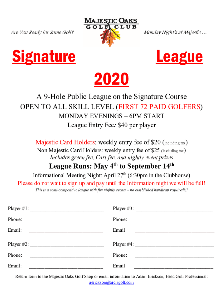 Are You Ready for Some Golf? Monday Nights at Majestic SignatureLeague 2020A 9Hole Public League on the Signature Course OPEN TO ALL SKILL LEVEL (FIRST 72 PAID GOLFERS) MONDAY EVENINGS 6PM START League