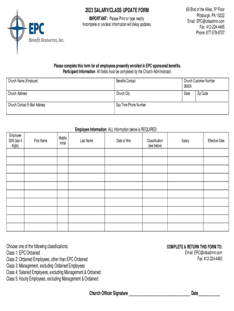 2023 SALARY/CLASS UPDATE FORM60 Blvd of the Allies, 5th Floor Pittsburgh, PA 15222 Email: EPC@cdsadmin.com Fax: 4122244465 Phone: 8775788707IMPORTANT: Please Print or type neatly. Incomplete or unclear