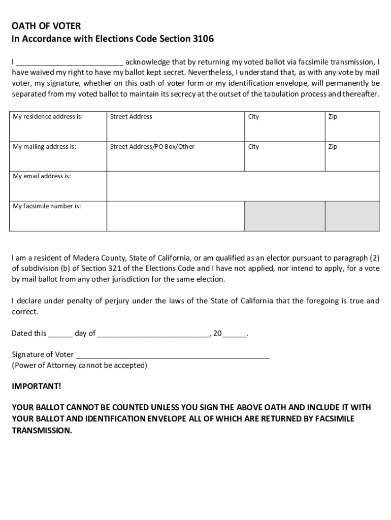 OATH OF VOTER In Accordance with Elections Code Section 3106 I ___ acknowledge that by returning my voted ballot via facsimile transmission, I have waived my right to have my ballot kept secret. Nevertheless,