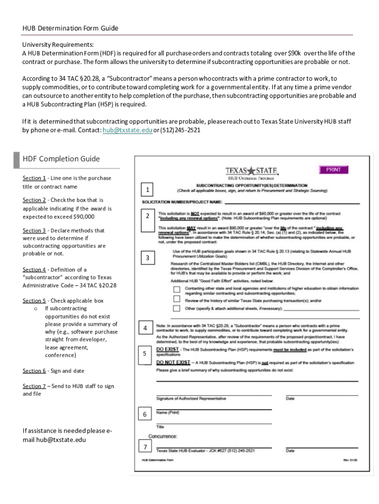HUB Determination Form Guide University Requirements: A HUB Determination Form (HDF) is required for all purchase orders and contracts totaling over $90k over the life of the contract or purchase.