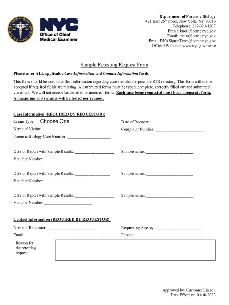 Department of Forensic Biology 421 East 26th street, New York, NY 10016 Telephone: 2123231207 Email: knori@ocme.nyc.gov Email: jrenta@ocme.nyc.gov Email:DNASigninTeam@ocme.NYC.gov Official Website: