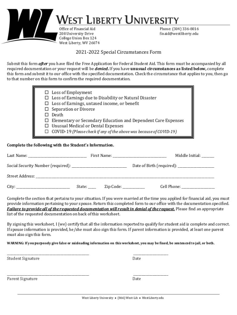 Office of Financial Aid 208 University Drive College Union Box 124 West Liberty, WV 26074Phone: (304) 3368016 finaid@westliberty.edu20212022 Special Circumstances Form Submits this form after you