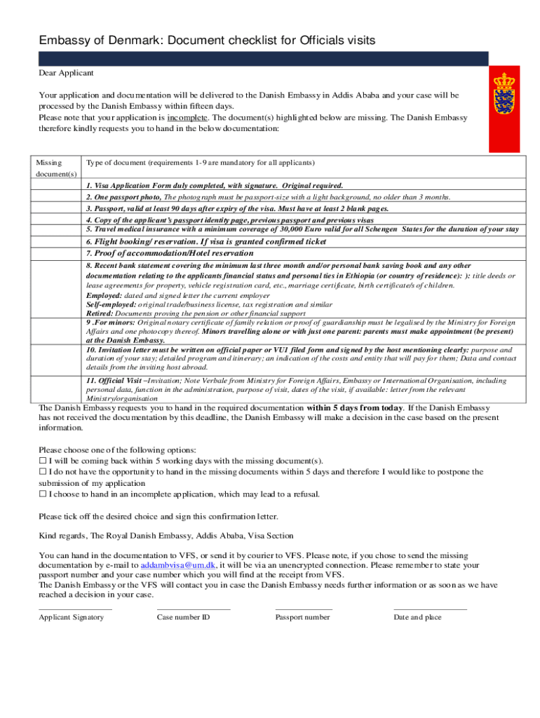 Embassy of Denmark: Document checklist for Officials visits Dear Applicant Your application and documentation will be delivered to the Danish Embassy in Addis Ababa and your case will be processed