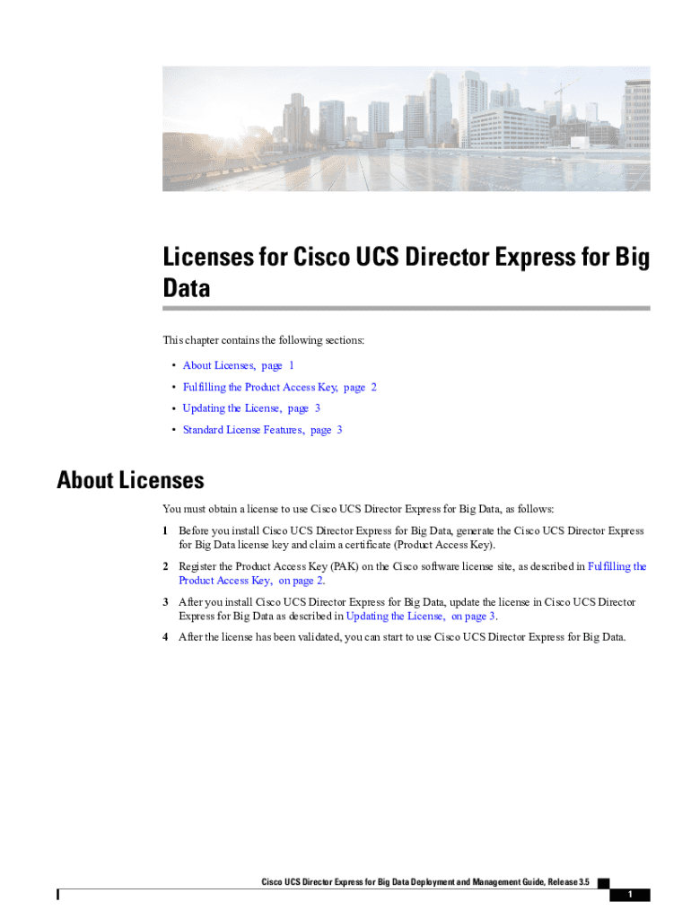 Licenses for Cisco UCS Director Express for Big Data This chapter contains the following sections: About Licenses, page 1 Fulfilling the Product Access Key, page 2 Updating the License, page 3 Standard