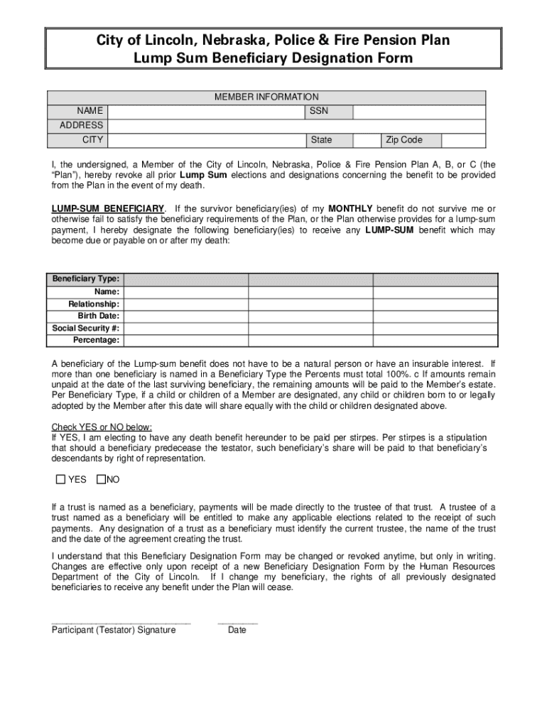 City of Lincoln, Nebraska, Police & Fire Pension Plan Lump Sum Beneficiary Designation Form MEMBER INFORMATION NAMESSNADDRESS CITYStateZip Code, the undersigned, a Member of the City of Lincoln, Nebraska,