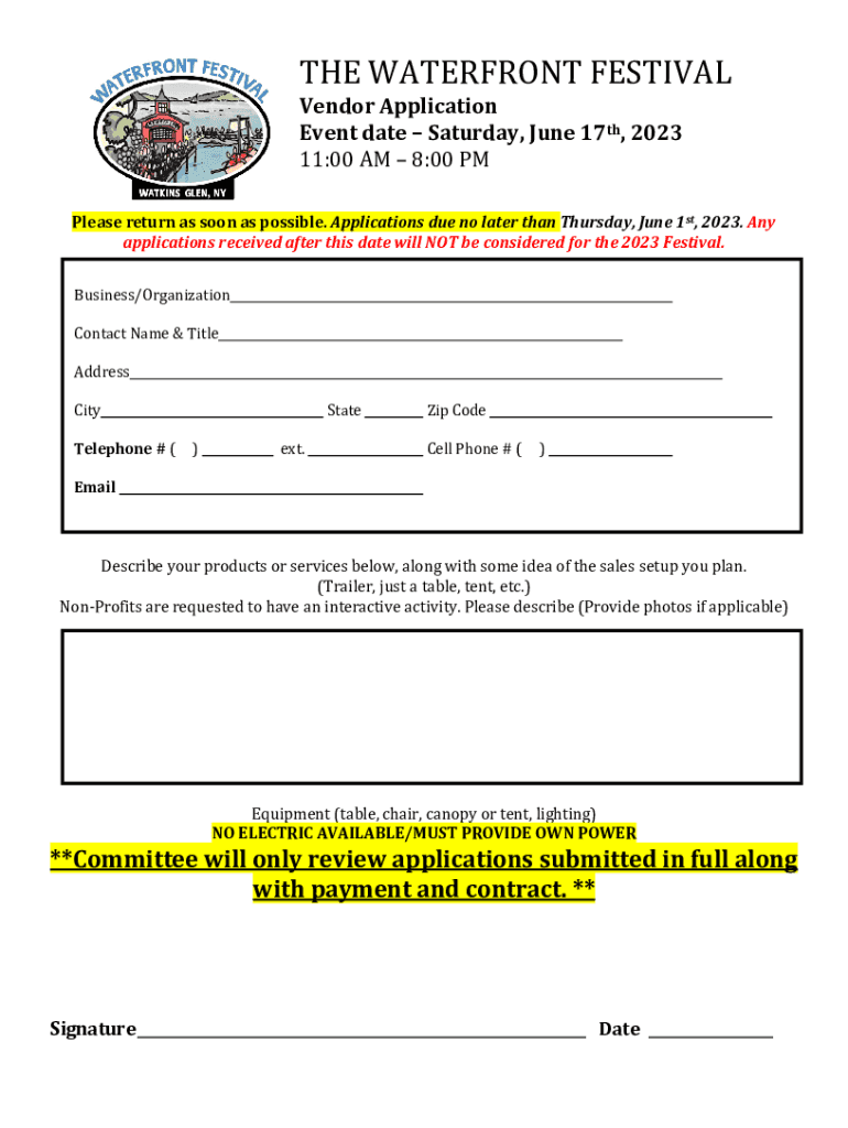 THE WATERFRONT FESTIVAL Vendor Application Event date Saturday, June 17th, 2023 11:00 AM 8:00 PMP lease return as soon as possible. Applications due no later than Thursday, June 1st, 2023. Any applications