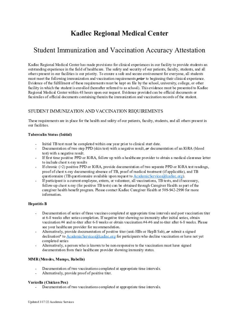 Adler Regional Medical Center Student Immunization and Vaccination Accuracy Attestation Adler Regional Medical Center has made provisions for clinical experiences in our facility to provide students