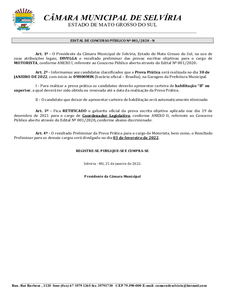 EDIT AL DE CONCURS PBL ICO N 001/2020 Part. 1 O President the Clara Municipal de Selvria, Est ado do Mato Grosso do Sul, no us ode