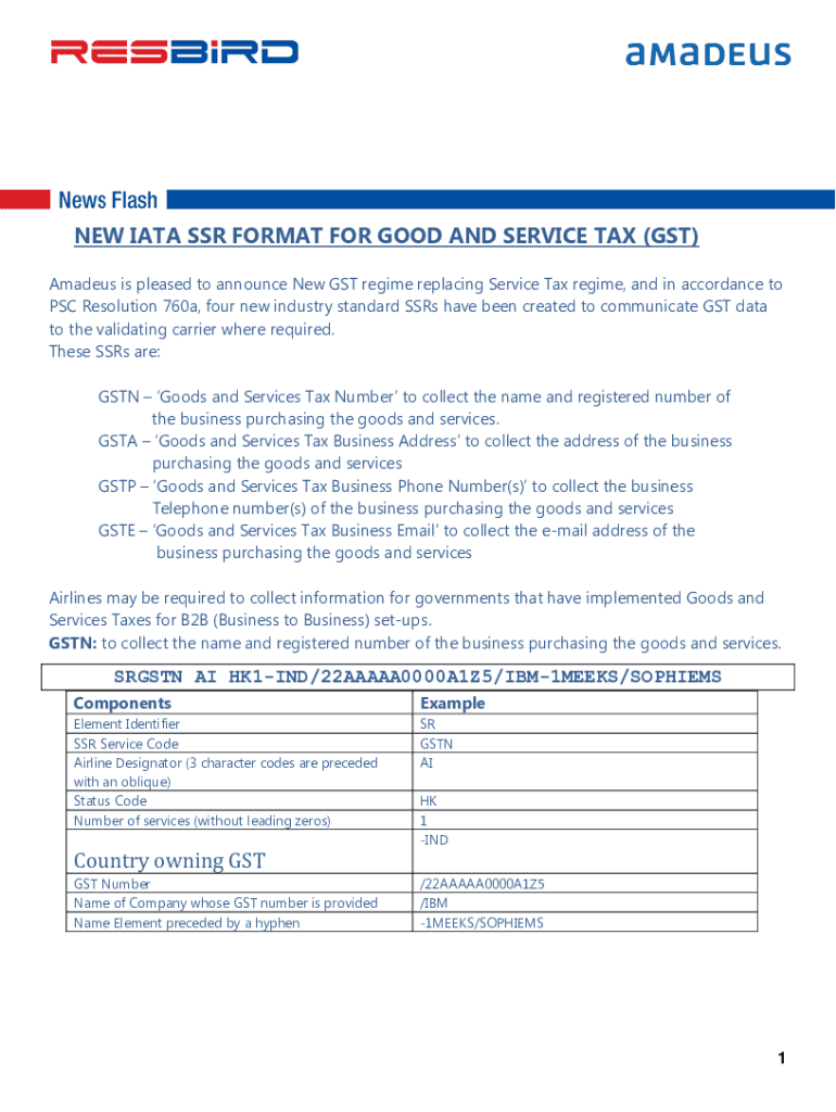 NEW IATA SSR FORMAT FOR GOOD AND SERVICE TAX (GST) Amadeus is pleased to announce New GST regime replacing Service Tax regime, and in accordance to PSC Resolution 760a, four new industry standard
