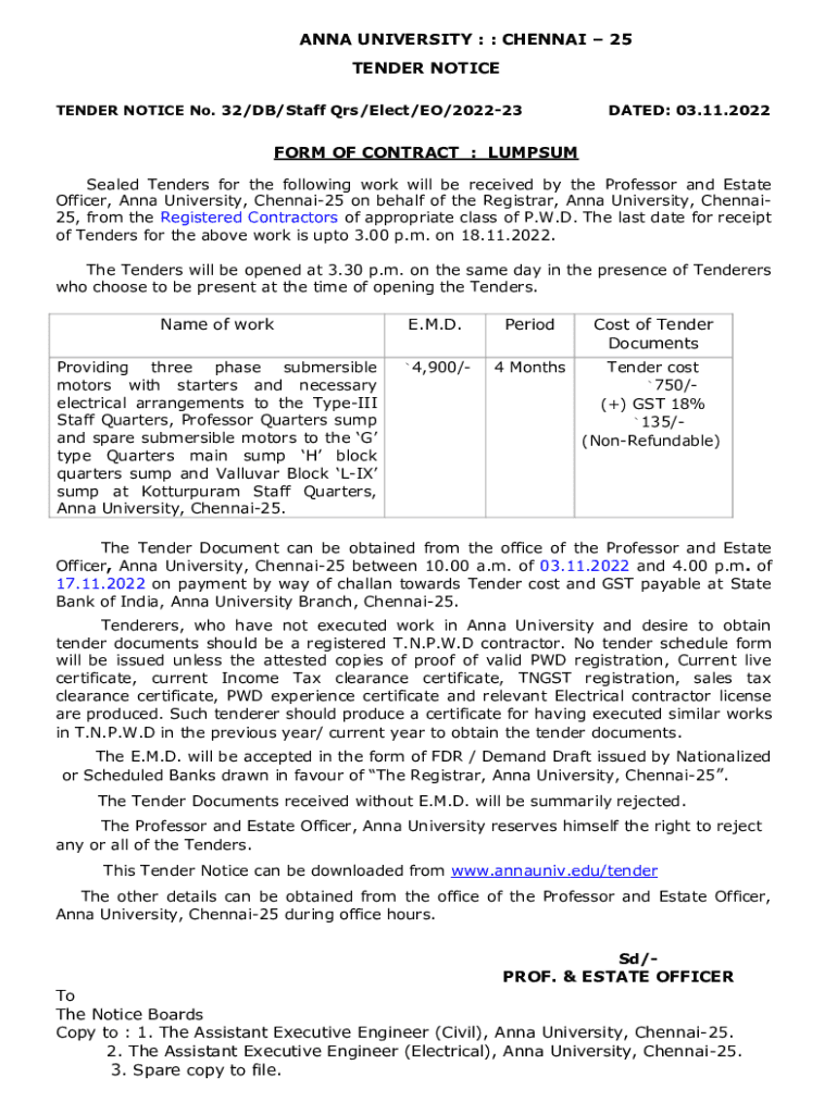 ANNA UNIVERSITY : : CHENNAI 25 TENDER NOTICE No. 32/DB/Staff Mrs/Elect/EO/202223DATED: 03.11.2022FORM OF CONTRACT : LUMPS Sealed Tenders for the following work will be received by the Professor and