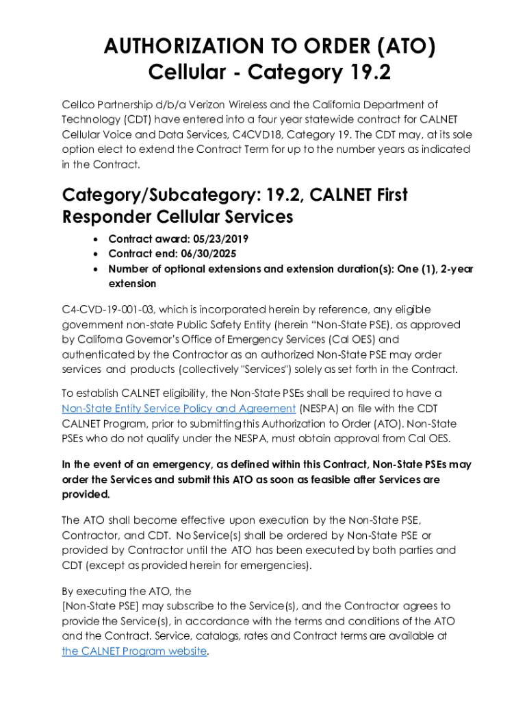 AUTHORIZATION TO ORDER (ATO) Cellular Category 19.2 Cello Partnership d/b/a Verizon Wireless and the California Department of Technology (CDT) have entered into a four-year statewide contract for