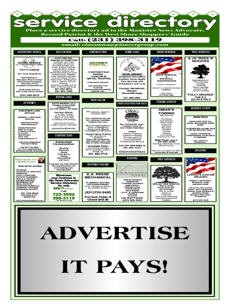 Service directory Place a service directory ad in the Minister News Advocate, Record Patriot & the West Shore Shoppers Guide Call: (231) 3983119 email: classmna@pioneergroup.com ADVENTURE TRAVELAUTO