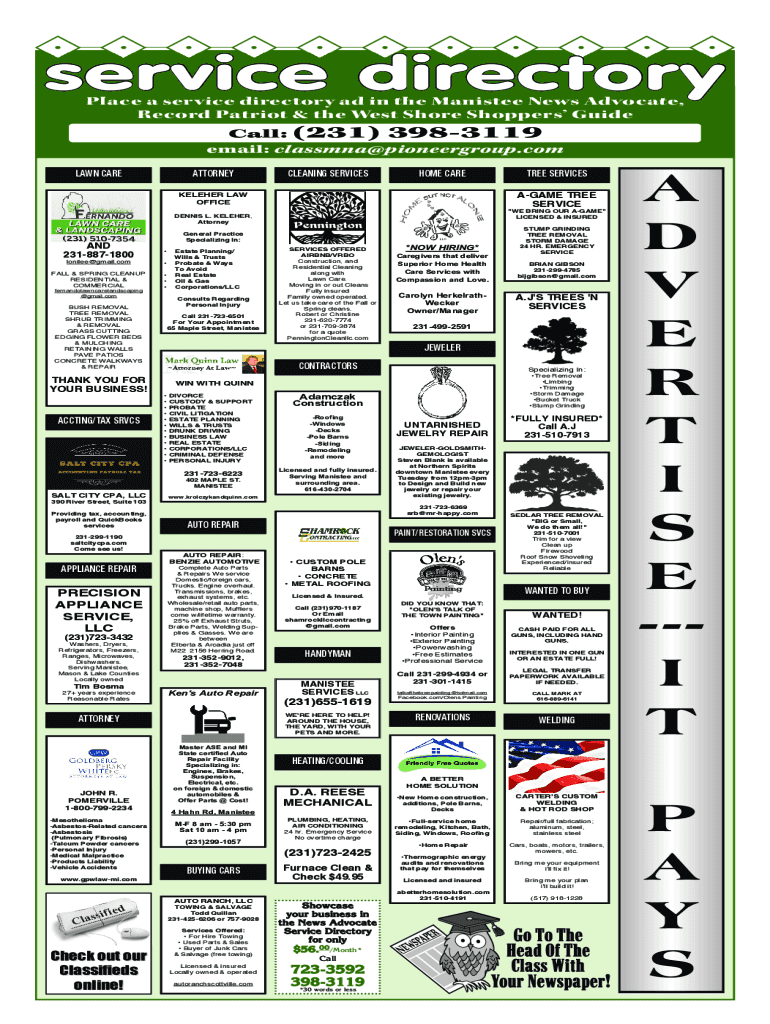 Service directory Place a service directory ad in the Minister News Advocate, Record Patriot & the West Shore Shoppers Guide Call: (231) 3983119 email: classmna@pioneergroup.com LAWN CAREATTORNEYCLEANING