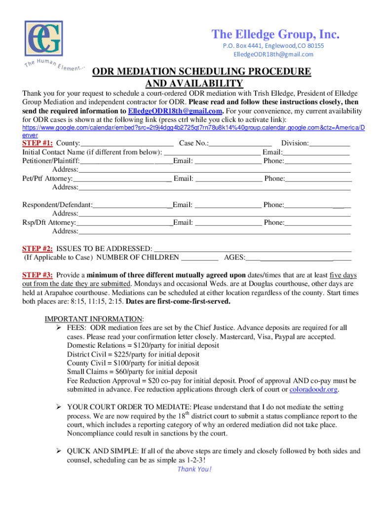 The Ell edge Group, Inc. P.O. Box 4441, Englewood, CO 80155 ElledgeODR18th@gmail.comODR MEDIATION SCHEDULING PROCEDURE AND AVAILABILITY Thank you for your request to schedule a court ordered ODR mediation