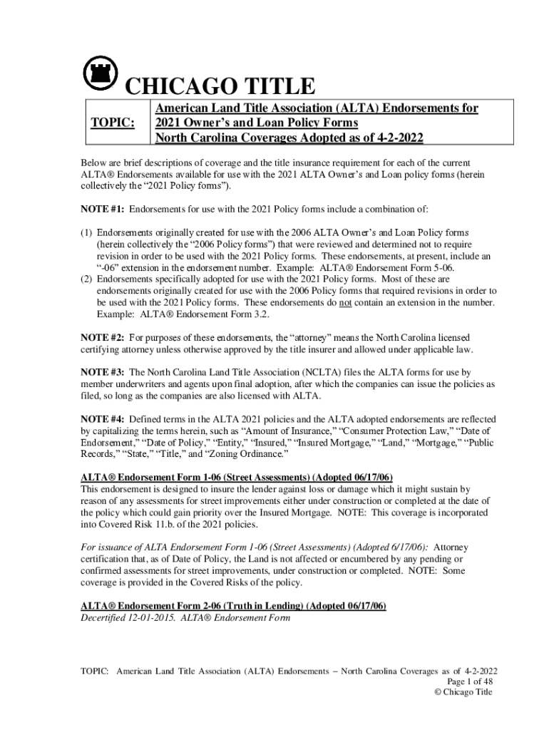 CHICAGO TITLE TOPIC:American Land Title Association (ALTA) Endorsements for 2021 Owners and Loan Policy Forms North Carolina Coverages Adopted as of 422022Below are brief descriptions of coverage