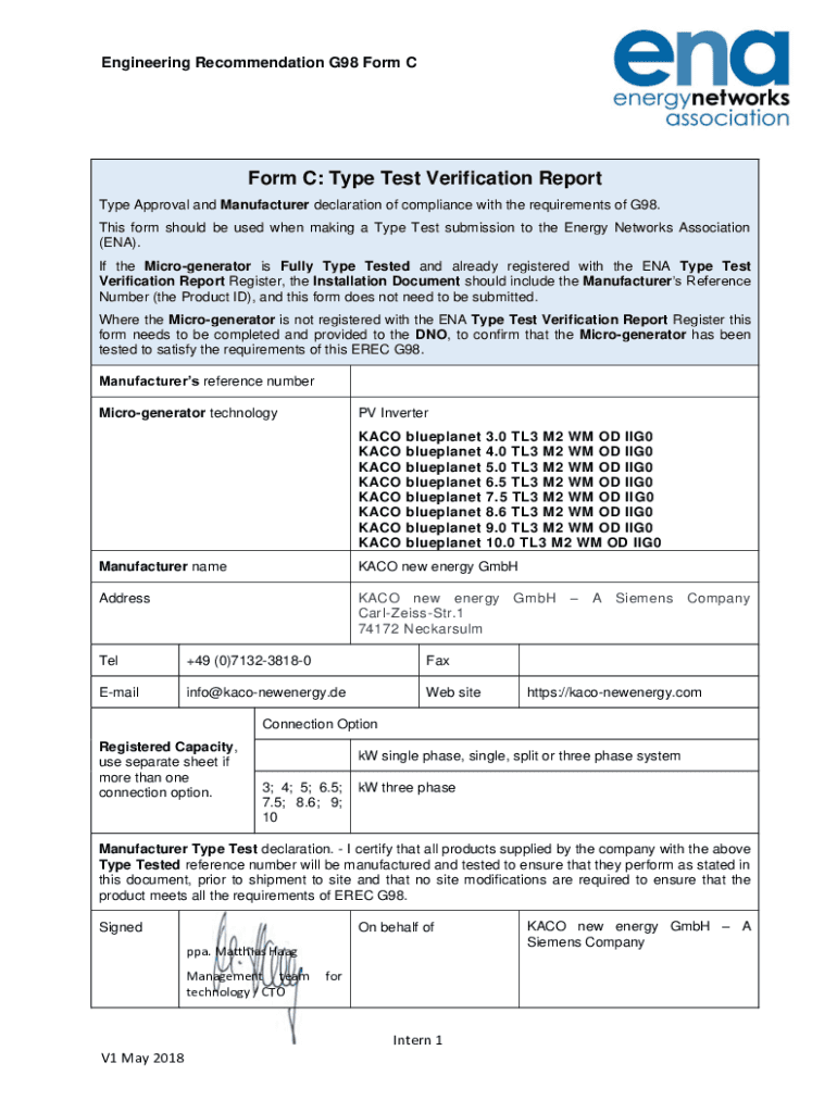 Engineering Recommendation G98 Form C: Type Test Verification Report Type Approval and Manufacturer declaration of compliance with the requirements of G98. This form should be used when making a Type