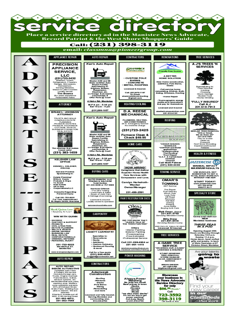 Service directory Place a service directory ad in the Minister News Advocate, Record Patriot & the West Shore Shoppers Guide Call: (231) 3983119 email: classmna@pioneergroup.comA D V E R T I S E I