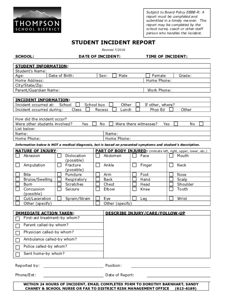 Subject to Board Policy EBB BR: A report must be completed and submitted in a timely manner. This report may be completed by the school nurse, coach or other staff person who handles the incident.